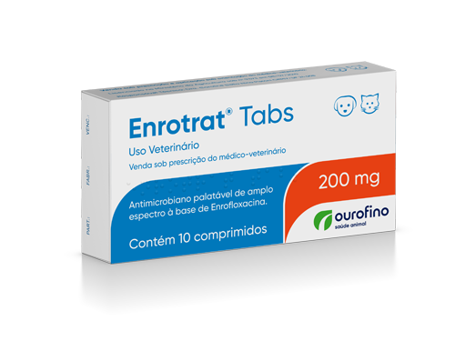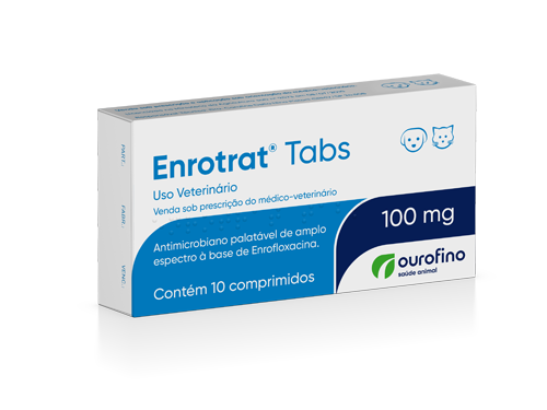 Enrotrat® Tabs é um antibiótico à base de enrofloxacina em formulação palatável. A enrofloxacina pertence à família das fluorquinolonas e se destaca por seu amplo espectro de ação e por sua rápida absorção, metabolização e distribuição. Com ação bactericida, Enrotrat® Tabs é indicado para o tratamento de infecções que acometem cães e gatos, causadas por Escherichia coli, Pasteurella multocida, Klebsiella pneumoniae, além da Bordetella bronchiseptica em gatos.